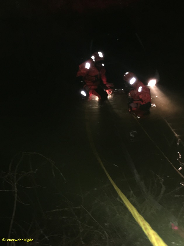 Samstag, 18. Februar 2017, 18:58 Uhr. Der Löschzug Lügde wurde durch die Leitstelle der Feuerwehr in Lemgo zu einem technische Hilfe Einsatz in die Nachbarstadt Bad Pyrmont alarmiert. Aus ungeklärter Ursache ist ein PKW über eine Wiese in die Emmer gerollt. Aufgrund der Wassertiefe forderte die Feuerwehr Bad Pyrmont den Löschzug Lügde mit den Wasserrettungsanzügen an. Die Einsatzkräfte befestigten an dem PKW zwei Schlupfe um diesen im Anschluss mittels einer Seilwinde aus der Emmer zu ziehen. Nachdem der PKW gesichert auf der Wiese stand, war der Einsatz für die Feuerwehr Lügde beendet.