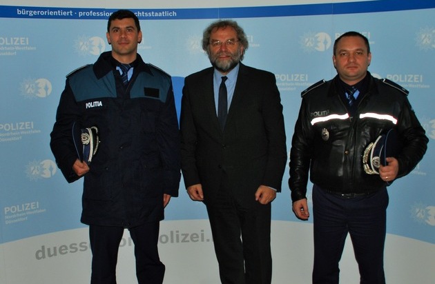 Polizeipräsident Norbert Wesseler begrüßte heute Nachmittag zwei Polizeibeamte aus Rumänien, die für mehrere Tage ihre Düsseldorfer Kollegen unterstützen werden. Möglich wird dieser Einsatz durch ein Abkommen zwischen EU-Staaten aus dem Jahr 2005.