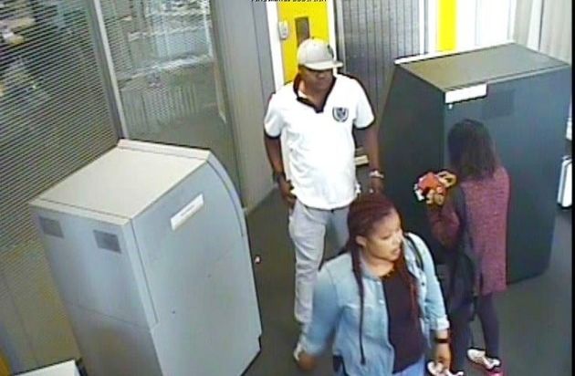 Die beiden dunkelhäutigen männlichen und weiblichen Täter können wie folgt beschrieben werden: Der Mann ist circa 40 Jahre alt. Er hatte keinen Bart und keine Brille. Bekleidet war er mit einem weißen T-Shirt mit Aufdruck auf der linken Brust, heller Stoffhose und einem grauen Basecap.