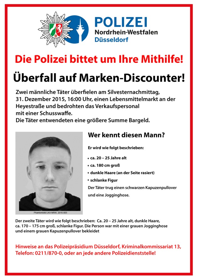 POL-D: Bewaffneter Raub am Silvesternachmittag - Lebensmitteldiscounter überfallen - Polizei fahndet mit Plakat und Phantombild - Wer kennt den Mann?