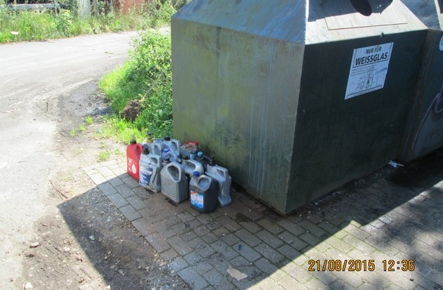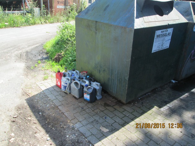 Unbekannte luden unmittelbar neben den Wertstoffcontainern elf mit Altöl gefüllte Kanister ab und entledigten sich somit der Abfälle.