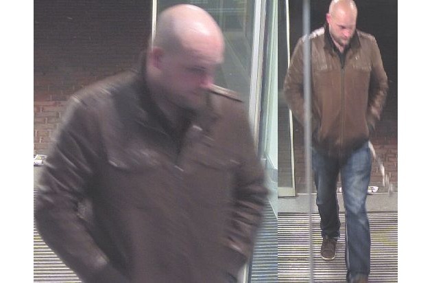 Gesucht wird eine männliche Person mit kräftiger Statur und einer Glatze im geschätzten Alter zwischen 25 und 35 Jahren. Zum Zeitpunkt der Tat trug der Mann eine Jeanshose sowie braune Lederjacke.