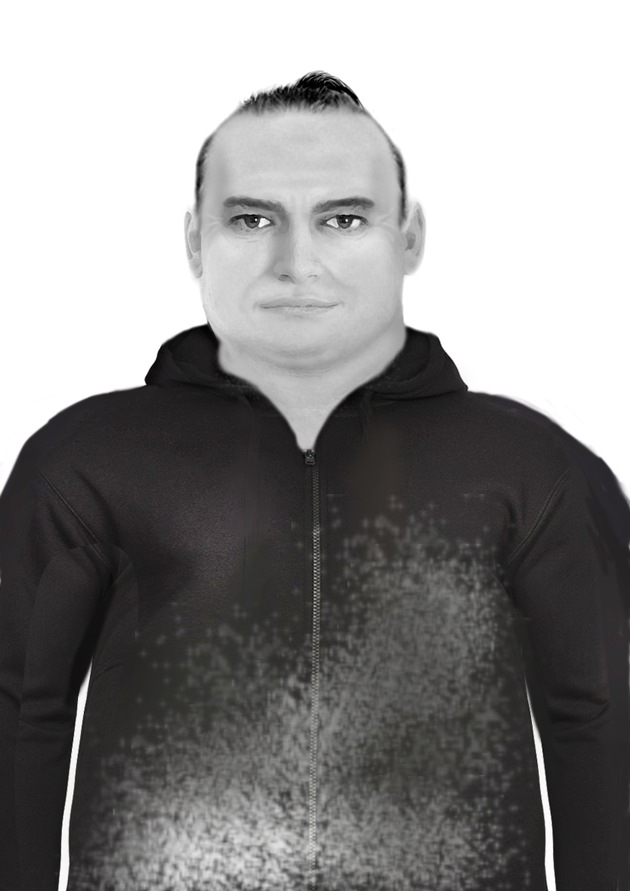 Der etwa 45 Jahre alte Mann mit rundlichem Gesicht ist ungefähr 1,8 Meter groß und hatte eine kräftige stämmige Statur. Seine dunklen Haare waren nach hinten gekämmt und zu einem Zopf zusammengebunden. Der Mann trug eine schwarze, leicht verwaschen wirkende Kapuzenjacke, unter der sein Bauchansatz zu erkennen war und vermutlich eine hellfarbene Jeans.