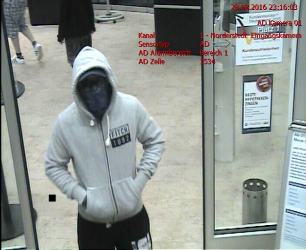 Bereits am 28.08.2016 kam es gegen 22.00 Uhr zu einem Einbruch in ein Einfamilienhaus in der Hafenstraße in Tornesch (Kreis Pinneberg). Die Täter drangen gewaltsam in das Haus der urlaubsbedingt abwesenden Eigentümer ein und erbeuteten Schmuck, Bargeld, Münzen, Uhren (darunter eine hochwertige Uhr des Herstellers Corum) sowie mehrere Kreditkarten. Noch in der Tatnacht wurden diese Kreditkarten bei der Sparda Bank in der Rathausallee in Norderstedt, bei der Sparda Bank im Kronstieg in Hamburg-Langenhorn und zuletzt bei der Commerzbank in der Holstenstraße in Kaltenkirchen erfolgreich eingesetzt und Barabhebungen getätigt. Dabei konnte ein maskierter Täter mit schwarzer Jogginghose der Marke "Uncle Sam" und einem grauen Kapuzenpulli der Marke "Fitch 1892" gefilmt werden. Die Polizei bittet jetzt mit diesen Aufnahmen um Mithilfe der Bevölkerung. Wer kennt die darauf abgebildete Person? Hinweise zum Täter oder zum Tatgeschehen bitte an die Kriminalpolizeistelle Pinneberg unter 04101-2020.
