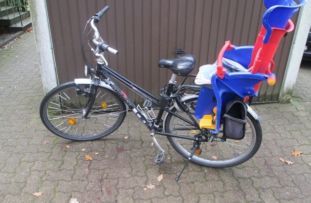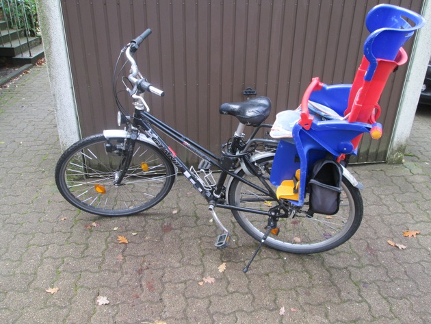 Daher fragt die Polizei: Wem gehört das abgebildete schwarze Damenrad der Marke "Giant"? Auffällig sind ein blau, rot, gelber Kindersitz sowie Seitentaschen an dem Gepäckträger.