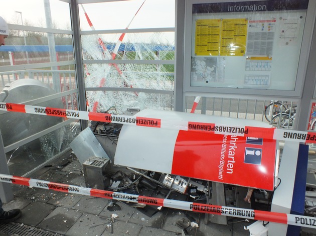 Am Sonntag, 12.04.2015, sprengten bislang unbekannte Täter gegen 03:00 Uhr einen Fahrkartenautomaten der Deutschen Bahn an dem Nahverkehrshaltepunkt Bredenbek.