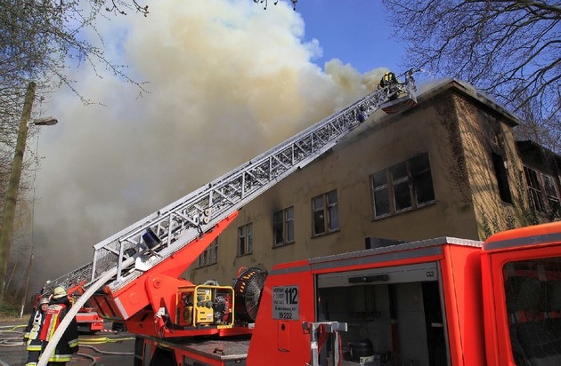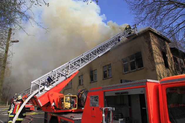 Am Nachmittag ist die Feuerwehr Essen zu einem Feuer in einer Gaststätte in Essen-Schonnebeck alarmiert worden. Bei Eintreffen der ersten Kräfte war rasch klar, dass es sich um ein leer stehendes Gebäude handelt, aus dessen Fenstern im ersten Obergeschoss Flammenschein sichtbar war. Die ersten Trupps konnten zur Brandbekämpfung im Innenangriff in das Gebäude eindringen, mussten allerdings nach kurzer Zeit wegen intensiver Wärmeentwicklung und Einsturzgefahr den Rückzug antreten. Das Feuer entwickelte sich an der rechten Ecke des Gebäudes in die hölzerne Dachkonstruktion und zog nach links. Dabei kam es immer wieder zu Durchzündungen der Dachhaut mit intensiver Rauchentwicklung. Mit insgesamt 70 Einsatzkräften von Berufs- und Freiwilliger Feuerwehr läuft der Einsatz seit nunmehr (Stand 20.00 Uhr) vier Stunden, das Dach ist weitestgehend zerstört. Die hölzerne Konstruktion des Objektes gibt dem Feuer ausreichend Nahrung, es lodert immer wieder auf. Die Vorbereitungen für den Einsatz in die Nacht laufen, Beleuchtungsgerät des Technischen Hilfswerkes ist angefordert. Die Hallostraße ist in Höhe der Einsatzstelle gesperrt, das wird auch während der kommenden Nacht so bleiben.Wir berichten weiter. (MF)
