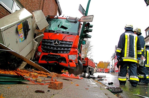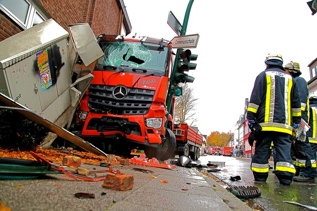 FW-E: LKW gegen Ampelmast und Fassade gerollt, erste Meldung: Fahrer eingeklemmt