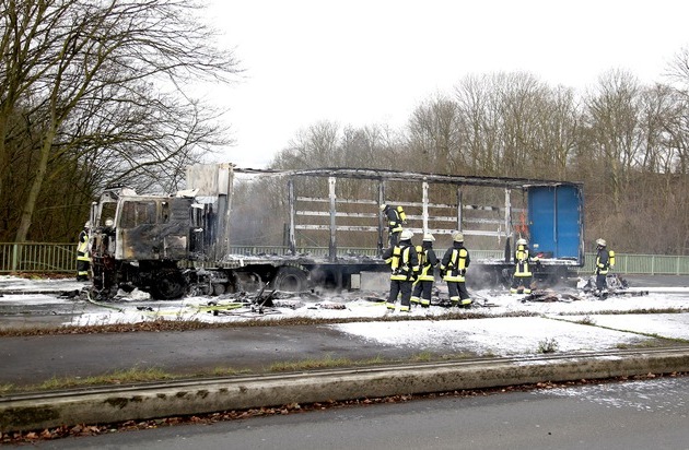 Auf der Bottroper Straße ist am Vormittag ein Sattelzug (40-Tonner) in Brand geraten. Das Fahrzeug war in Richtung Stadtmitte unterwegs und hatte 15 Tonnen Kunststoffstoßstangen geladen. Etwa 350 Meter hinter der Hafenstraße vernahm der 30jährige Fahrer einen Knall und bemerkte, dass das Fahrzeug nach rechts zog. Er brachte das erst zweieinhalb Jahre alte Gespann auf der Brücke oberhalb der S-Bahn-Linie 2 zum Stehen und stieg aus, um nach der Ursache zu suchen. Zu diesem Zeitpunkt brannte die Zugmaschine schon. Das Feuer breitete sich rasend schnell aus, erfasste den Auflieger und die Ladung. Der Fahrer konnte nur tatenlos zusehen, wie sein Fahrzeug ein Raub der Flammen wurde, er brachte sich in Sicherheit. Mehrere kleine Detonationen zeigten an, dass die Reifen und die Luftbälge der Federung durch die große Hitze zerplatzten. Eine schwarze Rauchsäule stieg auf, der Wind drückte den Rauch in Richtung Nordosten. Die Luftbewegung durchmischte den intensiv riechenden Brandrauch. Bei Eintreffen der ersten Einsatzkräfte, die die Rauchsäule, aus der Stadtmitte kommend, bereits sehen konnten, brannte das Gespann in voller Ausdehnung. Mit Wasser und Schaum löschten die Männer das Gefährt, konnten einen Totalverlust allerdings nicht verhindern. Übrig blieb nur ein verkohltes Gerippe. Für die Dauer der Lösch- und Bergungsarbeiten sperrte die Polizei die Bottroper Straße zunächst vollständig, später konnte die Spur Richtung Norden freigegeben werden. Aktuell ist ein Abschleppunternehmer vor Ort und beseitigt das Wrack. Verletzt wurde niemand, die Höhe des Sachschadens ist noch nicht ermittelt. Ereignis am Rande: Unterhalb der Einsatzstelle (Brücke über Bahn-Gleise) schlief ein Obdachloser tief und fest. In seinen Schlafsack gewickelt, hatte er von den dramatischen Ereignissen über sich nichts mitbekommen. Ein Erkundertrupp weckte ihn und schickte ihn vorsichtshalber aus dem Gefahrenbereich. (MF)