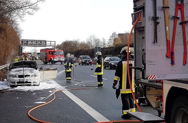 Heute Vormittag ist auf der A40 ein BMW-Cabrio ausgebrannt. Die 38 Jahre alte Fahrerin blieb unverletzt. Sie war auf der Autobahn in Richtung Mülheim unterwegs, als sie im Fahrzeug Brandgeruch wahrnahm. Kurz darauf sah sie Flammen aus dem Motorraum vor der Windschutzscheibe flackern. Geistesgegenwärtig fuhr sie auf den Standstreifen, rollte in Richtung Ausfahrt der Anschlussstelle Essen-Kray (Krayer Platte) und alarmierte die Feuerwehr. Bei Eintreffen der ersten Kräfte stand das Fahrzeug bereits im Vollbrand, mit Wasser und Schaum löschten die Männer das Feuer. Während des Einsatzes waren zwei der drei Fahrspuren gesperrt. Das Wrack muss abgeschleppt werden, bis zur Bergung bleibt die Autobahnpolizei vor Ort und sichert die Einsatzstelle. Warum das 1er Cabrio in Brand geriet, ist noch nicht klar. (MF)