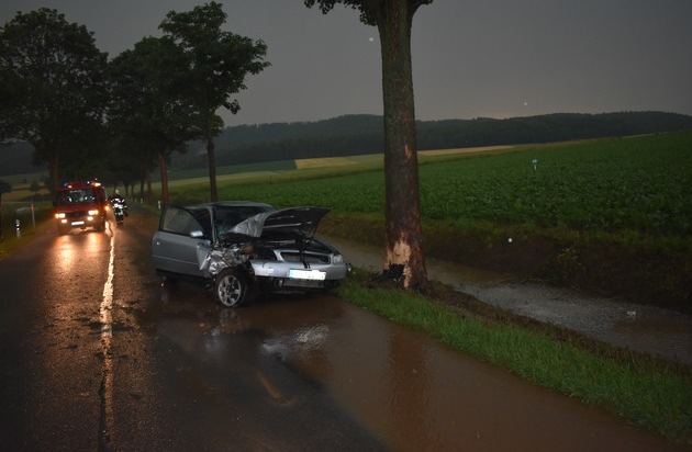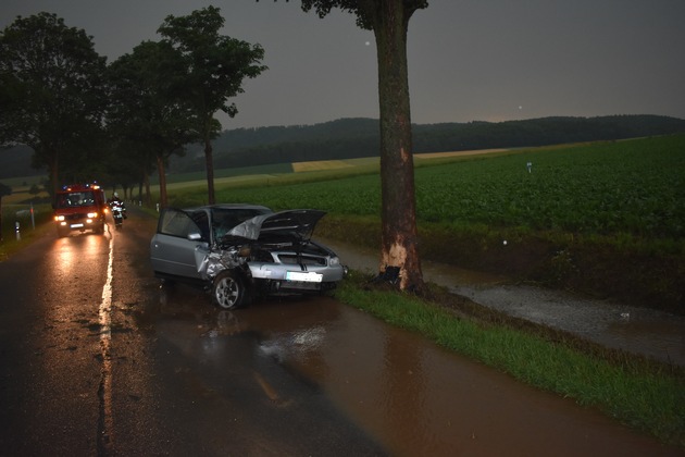 Bültum/ Wehrstedt (web) - Am heutigen Donnerstag, gegen 19:00 Uhr, kam es auf der K 315, von Bültum nach Wehrstedt zu einem folgenschweren Verkehrsunfall. Ein 26-Jähriger aus dem Stadtgebiet Bockenem befuhr zum Unfallzeitpunkt die o. g. Straße, als aufgrund starker Regenfälle und überlaufender Straßengräben die Fahrbahn überflutet war. Daraufhin verlor der Bockenemer die Kontrolle über seinen Pkw, kam nach rechts von der Fahrbahn ab und prallte gegen einen massiven Straßenbaum. Aufgrund erster Meldungen wurde neben der Polizei auch ein Rettungswagen zur Unfallstelle entsandt. Glücklicherweise wurde der Bet. 01 bei dem Unfall nicht verletzt. An seinem ca. 20 Jahre alten Pkw entstand jedoch Totalschaden in Höhe von ca. 2.000 Euro. Auch der Baum wurde beschädigt. Beim Eintreffen der Polizei stand die Fahrbahn erheblich unter Wasser und war mit Schlamm überzogen. Die Gräben waren völlig verstopft, so dass kein Wasser ablaufen konnte. Daraufhin wurden die ehrenamtlichen Helfer der Freiwilligen Feuerwehren aus Wehrstedt und Bültum angefordert. Neben der Unterstützung bei den erforderlichen Straßensperrungen wurde gemeinsam die Lage besprochen. Schließlich wurde die Straßenmeisterei Bockenem zur Sperrung der K 315 angefordert, da andere Maßnahmen nicht erfolgversprechend waren. Der Pkw wurde abgeschleppt.