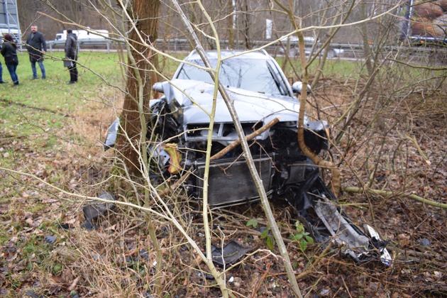 Nach bisherigem Ermittlungsstand befuhr ein bislang unbekannter Sattelzug, zu dem keine weitere Beschreibung vorliegt, den Hauptfahrstreifen der noch zweispurig ausgebauten Autobahn 7 vor der Anschlußstelle Derneburg in Fahrtrichtung Kassel. Ein 39-jähriger Helmstedter befuhr mit seinem grauen Pkw Audi Kombi bereits den Verzögerungsstreifen im Bereich der Anschlußstelle und wollte die Autobahn auf die B 6 in Fahrtrichtung Goslar verlassen. Als der Sattelzug in Höhe des grauen Audi fuhr, wechselte der Sattelzug ohne auf den Audi zu achten ebenfalls auf den Verzögerungsstreifen. Um einen Zusammenstoß zu verhindern, wich der Fahrer des Audi nach rechts aus, bremste und kam auf der feuchten Fahrbahn im Ausfahrtbereich der Anschlußstelle in Fahrtrichtung Derneburg/Hildesheim nach links von der Fahrbahn ab. Er fuhr ca. 30 Meter über die Rasenfläche und prallte derart stark gegen zwei Bäume, daß die Airbags im Pkw auslösten. Der Aufprall muß so stark gewesen sein, daß sich das Heck des Pkw aufrichtete und erst hinter einem weiteren Baum zum Stehen kam. Der gesamte Frontbereich wurde stark eingedrückt und viele Fahrzeugteile waren abgerissen. Durch den Unfall wurden drei der vier Insassen leicht verletzt. Zwei Verletzte, eine 33-Jährige aus Helmstedt und der 39-jährige Fahrzeugführer wurden zur ambulanten Behandlung ins St. Bernward-Krankenhaus nach Hildesheim verbracht. Ein 28-jähriger aus Wolfenbüttel verzichtete auf eine Untersuchung vor Ort. Ein 34-jähriger aus Helmstedt blieb unverletzt. Zur Bergung des Pkw wurde die Ausfahrt in Richtung Hildesheim für ca. 45 Minuten gesperrt.