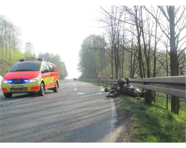 Mit schweren Verletzungen musste am gestrigen Donnerstagnachmittag ein 59jähriger Kradfahrer mit dem Rettungshubschrauber in das Nordstadt-Krankenhaus in Hannover geflogen werden. Er war in der Gemarkung Eschershausen auf der Bundesstraße 64 mit seiner Maschine nach einem Überholvorgang nach rechts von der Fahrbahn abgekommen und seitlich gegen die Schutzplanke geraten. Sein 17jähriger Soziusfahrer wurde leicht verletzt und wurde mit dem Rettungswagen zur Untersuchung ins Holzmindener Krankenhaus eingeliefert. Gegen 17:00 Uhr befuhr der Mann aus Hannover mit seiner BMW K 1300 S die B 64 aus Eschershausen kommend in Richtung Negenborn. Nach erfolgtem Überholvorgang in einer Linkskurve kam der 59jährige mit seinem 17jährigen Beifahrer nach rechts von der Fahrbahn ab und prallte gegen die Schutzplanke rechts der Fahrbahn. Während der Fahrer schwer verletzt wurde, kam der 17jährige Soziusfahrer aus Isernhagen mit Prellungen davon. Am Krad entstand erheblicher Sachschaden (5.000,-- EUR).