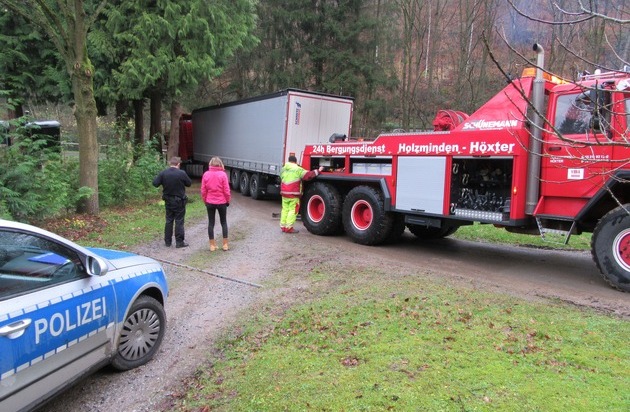Für die Polizei keine Seltenheit bei wochenlangen Witterungen wie momentan: Schwere Fahrzeuge "sacken" im Straßennebenraum aufgrund des aufgeweichten Erdreichs ein und kippen um bzw. drohen mindestens umzukippen und sind nicht in der Lage, sich aus einer solchen Situation ohne fremde Hilfe zu befreien. So auch geschehen am gestrigen Mittwochvormittag, als ein Sattelzug im Bereich der Revierförsterei Rottmünde in der Gemarkung Boffzen aufgrund der Straßenführung zwangsläufig auf den Straßennebenraum geriet. Letztlich hatte der Fahrer aber noch Glück im Unglück, soll heißen, der Sattelzug sackte zwar stark ein, konnte aber nicht umkippen, da ein starker Baum im Straßennebenraum ein Umkippen des Sattelaufbaus verhinderte. Allerdings hatte der Fahrer mit eigenen Mittel keine Chance, sich wieder selbst zu befreien. Nur mit dem Einsatz von "schwerem Gerät" war es schließlich möglich, den Sattelzug aus der misslichen Lage zu befreien, ohne dass nennenswerter Schaden entstanden ist. Vor diesem Hintergrund ist das hiesige Polizeikommissariat sehr froh, im Bereich ein sehr leistungsstarkes Unternehmen zu wissen, dass mit derartigen Problemstellungen äußerst sach- und fachgerecht klar kommt.