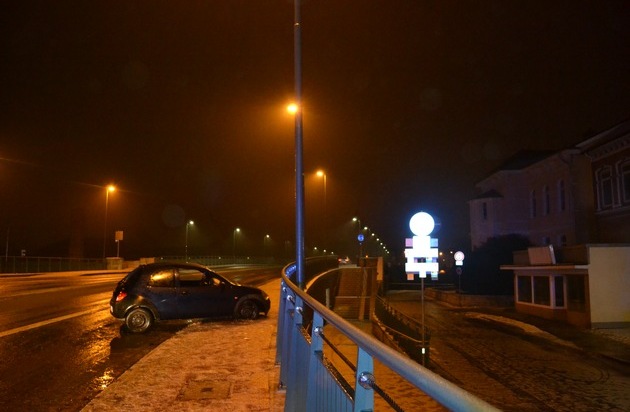 Am frühen Sonntagmorgen, gegen 05:45 Uhr, kam es auf der Hamelner Münsterbrücke zu einem Verkehrsunfall. Ein Ford Ka mit hannoverschem Kennzeichen bog von der Pyrmonter Straße kommend nach rechts auf die Münsterbrücke ein. Hier geriet der PKW auf glatter Fahrbahn ins Schleudern und prallte zunächst gegen den erhöhten Bordstein und anschließend noch gegen das Brückengeländer. Die drei männlichen Insassen aus dem Bereich Hannover (20, 21 und 21 Jahre alt) waren allesamt alkoholisiert und nur einer der drei ist im Besitz einer gültigen Fahrerlaubnis. Bislang konnte nicht zweifelsfrei geklärt werden, wer den PKW geführt hat. Ein Bereitschaftsrichter ordnete daher bei allen Dreien die Entnahme einer Blutprobe an. Der PKW und die Oberbekleidung der Personen wurde sichergestellt. Der entstandene Sachschaden wird auf 4.000 Euro geschätzt. Die drei Insassen sollen zuvor die Diskothek "Nachtschicht" besucht haben. Zeugen des Unfalls oder wer sonst Angaben zum Fahrzeugführer machen kann, wird gebeten sich mit der Polizei Hameln unter Telf.: 05151-933222 in Verbindung zu setzen.