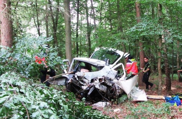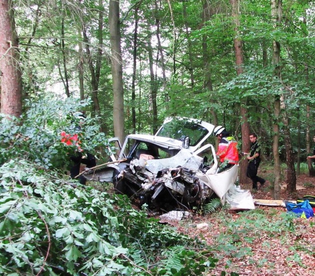 Der Mann, der erst am heutigen Tage um 07.40 Uhr von einem Spaziergänger in seinem Auto entdeckt wurde, ist am Ende einer langen Geraden eingangs der nachfolgenden Linkskurve ungebremst von der Fahrbahn abgekommen, zunächst gegen einen Leitpfahl und eine Leittafel geprallt, und anschließend gegen zwei Bäume. Der PKW, ein Ford Escord, wurde durch die Wucht des Auf-/Anpralls total zerstört und ist erst nach ca. 30 Metern im Wald zum Stehen gekommen. Für den 53-Jährigen, der in seinem Fahrzeug eingeklemmt wird, kommt jede Hilfe zu spät - er verstirbt noch an der Unfallstelle.