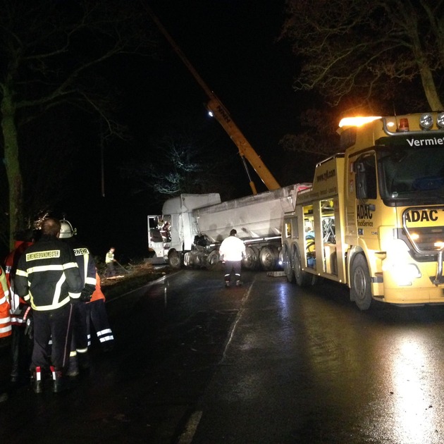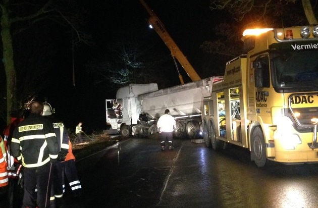 Am Mittwoch Abend gegen 19:36 Uhr befuhr ein 42-jähriger Mann mit seinem Lkw MAN die Bundesstraße 3 aus Ammensen in Richtung Varrigsen. Bei dem Lkw handelte es sich um einen Holztransporter, welcher Baumstämme geladen hatte. In Höhe der Unfallstelle zwischen den genannten Ortschaften verlor der Lkw plötzlich einen Baumstamm, welcher auf die Fahrbahn geriet. Ein zu diesem Zeitpunkt entgegenkommender Lkw DAF konnte nicht mehr ausweichen und überfuhr den Baumstamm. Der mit Salz beladene Kipper geriet von der Fahrbahn ab, streifte einen Straßenbaum und kam auf dem angrenzenden Acker zum Stehen. Bei dem Unfall wurde der Dieseltrank des Lkw DAF beschädigt, so dass mehrere Liter Diesel ins Erdreich ausgelaufen sind. Der 52-jährige Fahrer wurde dabei zum Glück nur leicht verletzt.