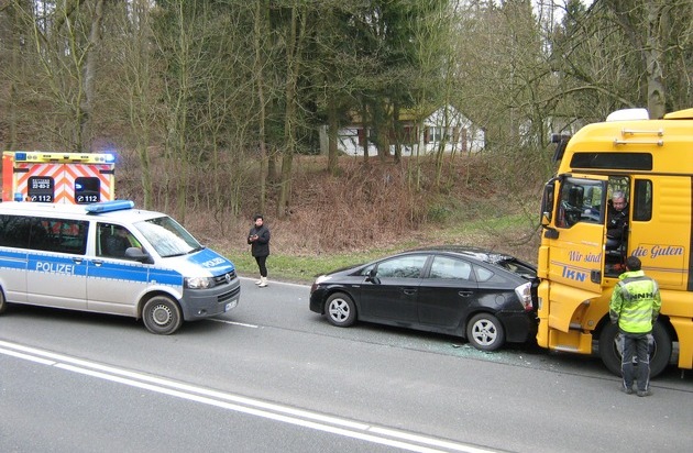 Heute Nachmittag gegen 15:00 Uhr kam es zu einem Verkehrsunfall auf der Bundesstraße 64, an dem ein Pkw und eine Sattelzugmaschine beteiligt waren. Die Insassen des Pkw wurden vorsorglich im Krankenhaus medizinisch versorgt.