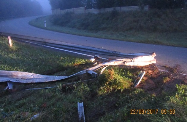 Am Freitag, dem 22.09.17, um 06:30 Uhr, teilten mehrere Autofahrer mit, dass es in Emmerthal im Bereich der Ab- / Auffahrt zur Bundesstraße 83 in Höhe der Berliner Straße zu einem Verkehrsunfall gekommen sein müsse, da die dortige Leitplanke beschädigt worden sei.