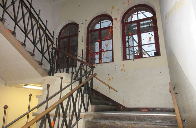 Im gesamten Gebäude öffneten sie die Schränke und Spinde, durchwühlten diese und warfen die Sachen anschließend auf den Boden. Einem Schrank wurden dort verwahrte Putzmittel entnommen und auf dem Boden verteilt. Ebenso wurde ein im Erdgeschoss vorgefundener Feuerlöscher teilweise entleert. Den größten Schaden richteten sie anschließend im 2. OG an, in dem sich der Film- und Musikraum, sowie die Aula der Schule befinden. Hier wurde der aus dem Erdgeschoss mitgeführte, sowie ein weiterer aufgefundener Feuerlöscher komplett entleert. Ebenfalls wurden diverse Flaschen mit Abdeckfarbe im Filmraum, als auch auf dem gesamten Treppen- und Flurbereich entleert. Fußboden, Wände und Decken wurden beschmiert. Selbst im Dachgeschoss wurde versucht die auf dem Boden liegenden Dämmung herauszureißen. Hier wurde mit gelber Kreide der Spruch "Wir waren hier die schwarzen Vier" an eine Wand geschrieben. Der dadurch entstandene Schaden wird nach Angaben der Polizei auf mindestens 15.000 Euro beziffert.