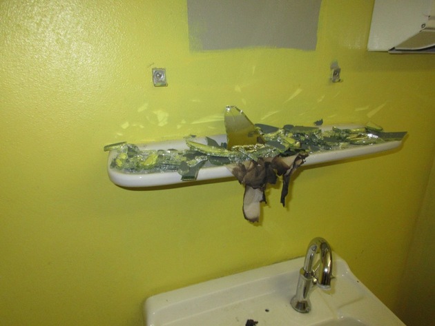 Nachdem sich die Täter über eine rückwärtige Tür Zutritt zum Gymnasium verschafft hatten, begannen sie mit ihrem Unwesen. Auch hier suchten sie alle Räumlichkeiten des dreigeschossigen Gebäudes auf und verwüsteten diese. So wurden Schränke, Lichtschalter, Spiegel, ein Fernseher und ein Schaukasten zerschlagen, die Scheiben einer Brandschutztür eingeschlagen, Bücher aus den Regalen und Plakate von den Wänden gerissen, Papierhandtücher entzündet, aber wieder abgelöscht. Auch wurden wieder Flüssigkeiten (Wasser, Spiritus, Flüssigreiniger) auf dem Boden verteilt.