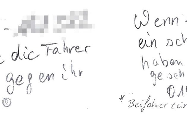 Die zum Fahrzeug zurückkehrende Fahrzeughalterin fand an der Windschutzscheibe eine handgeschriebene Notiz vor, auf der neben einem Kennzeichen eines möglichen Verursacherfahrzeug der Hinweis "Hatte die Fahrer tür gegen ihr Auto" vermerkt war. Auf der Rückseite des Zettels stand " Wenn sie da ein schaden* haben ich hab es gesehen *Beifahrertür". Abschließend war eine Mobilfunknummer vermerkt, die aber mal wieder nicht vergeben ist.