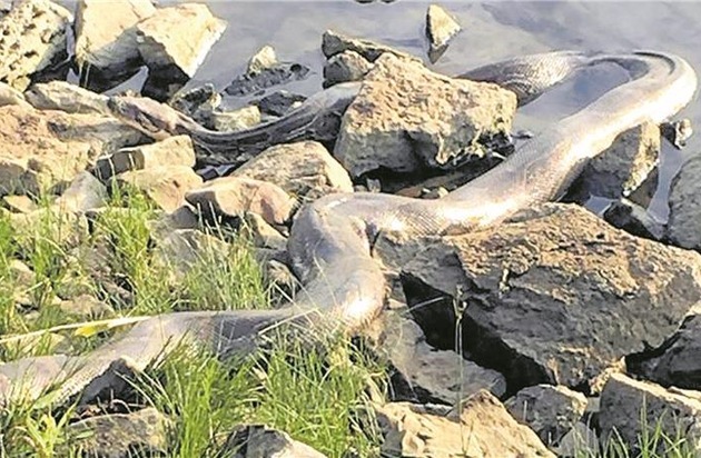 Angler haben am frühen Sonntagmorgen (17.06.2018) eine Riesenschlange am Weserufer in Emmerthal entdeckt und die Polizei informiert.