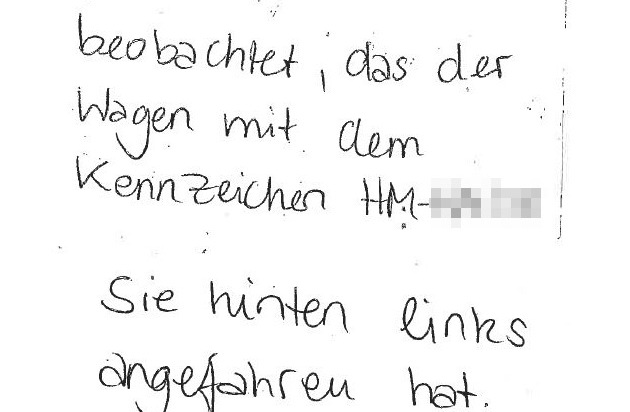 Die Fahrerin des nun beschädigten Fahrzeuges stellte ihren grauen Toyota Corolla gegen 09.00 Uhr auf einem Parkplatz vor dem Bahnhof ab. Als sie gegen 13.50 Uhr zum Wagen zurückkehrte, fand sie neben den frischen Beschädigungen im Heckbereich auch eine handgeschriebene Notiz, die offensichtlich von einer noch unbekannten Zeugin am Toyota hinterlassen wurde.