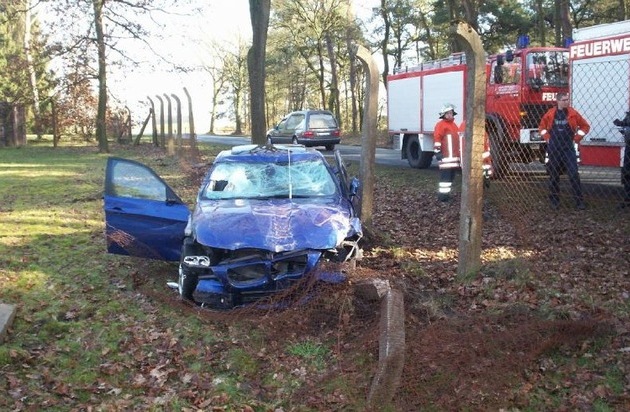 Gegen 12.20 Uhr war der 45-Jährige mit seinem 3-er BMW auf der Kreisstraße aus Loccum kommend in Richtung Seelenfeld unterwegs. In der Loccumer Heide, kurz vor der Landesgrenze nach Nordrhein-Westfalen, kam der Mann aus Petershagen auf gerader Strecke aus ungeklärter Ursache nach rechts von der Straße ab. Im unbefestigten Seitenstreifen touchierte das Fahrzeug einen Baum und durchbrach einen Maschendrahtzaun, wobei auf rund 15 Meter Länge vier massive Betonpfeiler überfahren wurden.