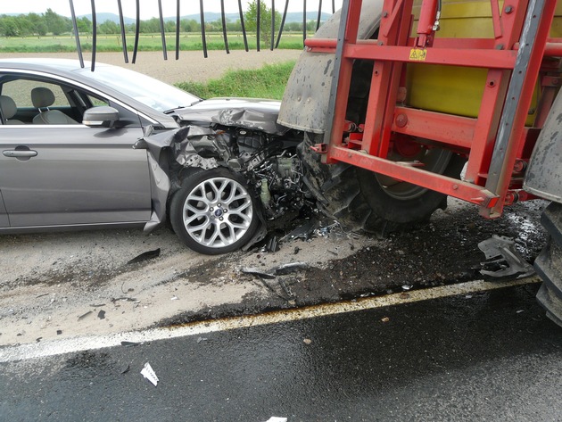 Es kam zu einer Kollision der beiden Fahrzeuge, wobei der Pkw-Fahrer großes Glück hatte, dass er mit der Fahrzeugfront auf den hinteren linken Reifen des Traktors prallte.