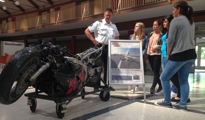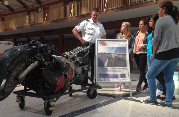 Eindrucksvoll unterstützte ein in der Aula aufgestelltes Unfallwrack eines Motorrades Grünvogels Ausführungen und regte zum Innehalten und Gespräch an.