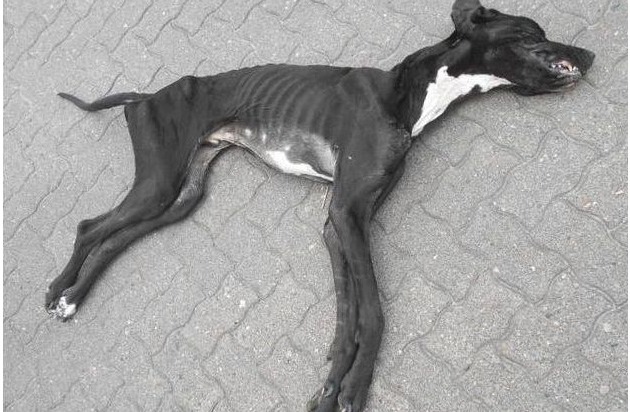 In den dortigen Graben wurde die schwarz-weiße Dogge, abgemagert bis auf die Knochen, abgelegt.
