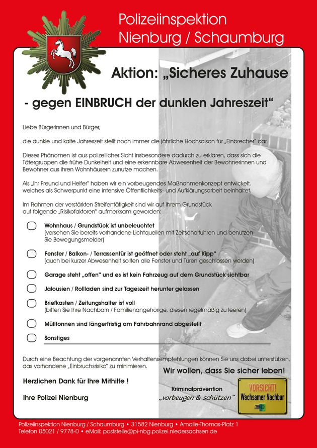 NIENBURG/SCHAUMBURG (mie) - Aufgebrochene Wohnungs- oder Terrassentüren, aufgehebelte Fenster, durchstöberte Schränke und Schubladen. Chaos überall! "Diebstahl und Einbruch sind für die meisten Menschen eine Schock auslösende Erfahrung. Neben dem rein materiellen Verlust bedeutet gerade ein Einbruch eine erhebliche Beeinträchtigung des Sicherheitsgefühls", weiß Gabriela Mielke, Polizeipressesprecherin.