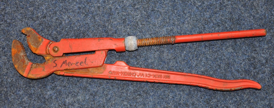 Von den Dieben wurde die orange, cirka 45cm lange Wasserpumpenzange am Tatort zurückgelassen. Besonders auffällig ist ein schwarzer Namesschriftzug, der augenscheinlich mit einem Edding aufgebracht wurde. Der Name lautet "S. Menzel" oder "S. Merzel".