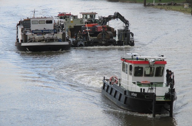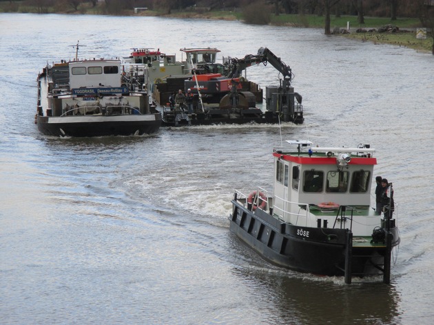Mit drei Schiffen vom Wasser- und Schifffahrtsamt wurde am Dienstagvormittag, 09.02.16, das Binnenschiff, das Flüssigdünger geladen hatte, geborgen und zur Liegestelle nach Nienburg geschleppt.