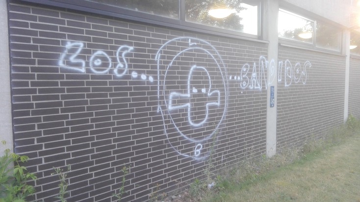 Nachdem der Hausmeister erfolglos versucht hatte diese Schmierereien zu entfernen, muss jetzt eine Spezialfirma mit der Reinigung beauftragt werden.