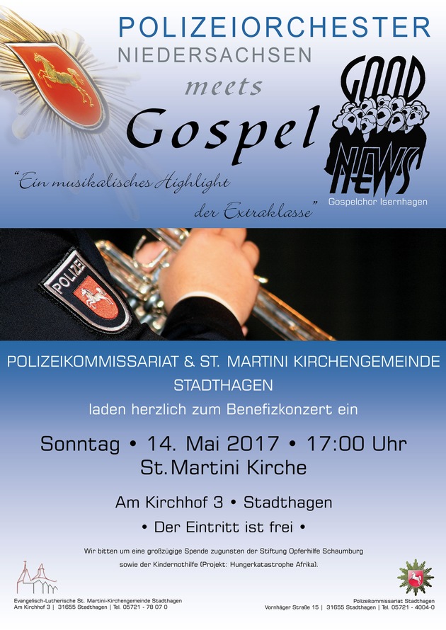 (BER)Einen musikalischen Hochgenuss der Extraklasse verspricht eine Veranstaltung, die aufgrund einer tollen Kooperation zwischen der Polizei Stadthagen, der Stadthäger St. Martini-Kirchengemeinde, dem Polizeiorchester Niedersachsen und dem Gospelchor Isernhagen zustande gekommen ist. Am Sonntag, dem 14. Mai 2017 ab 17.00 Uhr wird unter dem Titel "Polizeiorchester Niedersachsen meets Gospel" ein Benefizkonzert in der Stadthäger Martinikirche veranstaltet. Martin Runnebaum, Oberprediger der Kirchengemeinde und Wolfgang Kanngießer, Polizeikommissariatsleiter in Stadthagen, hatten in einer gemeinsamen Aktion mit dem Polizeiorchester diese Veranstaltung nach Stadthagen holen können. Am Muttertag genießen die Besucher des Konzertes außerdem eine Premiere - in einer solchen Veranstaltung sind Orchester und Chor noch nicht aufgetreten. Aufgrund des Veranstaltungsortes, der St. Martini - Kirche, wird für das Konzert kein Eintritt erhoben. Martin Runnebaum und Axel Bergmann, Pressesprecher der Polizei, bitten stattdessen gemeinsam um eine großzügige Spende der Besucher. Die eine Hälfte der Spenden soll auf Wunsch der Polizei an die Stiftung Opferhilfe in Schaumburg gehen, die andere Hälfte auf Wunsch der Kirche an die Kindernothilfe Hungerkatastrophe Afrika. "Ein musikalisches Highlight dieser Extraklasse kann man sonst nicht bei freiem Eintritt erleben", so die beiden Organisatoren", bitte spenden Sie großzügig!"