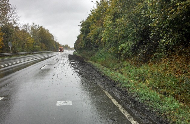 Die Bundesstraße 65 war gestern um 13.00 Uhr im Bereich Bückeburg, Fahrtrichtung Stadthagen, auf einer Länge von ca. 50m derart stark verschmutzt, dass die Beamten die Straßenmeisterei für Reinigungsarbeiten hinzuziehen mussten, weil auf Grund des Regens und der Verschmutzung ein Gefahr für die Verkehrsteilnehmer bestand.