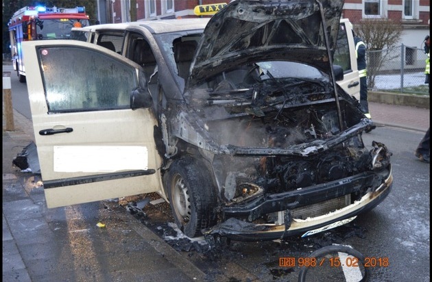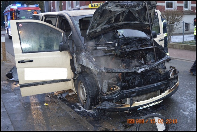 Auf der Fürst-Ernst-Straße in Bückeburg, vor dem Seiteneingang zur Grundschule Am Harrl, hat heute morgen gegen 07.40 Uhr ein Großraumtaxi gebrannt.
