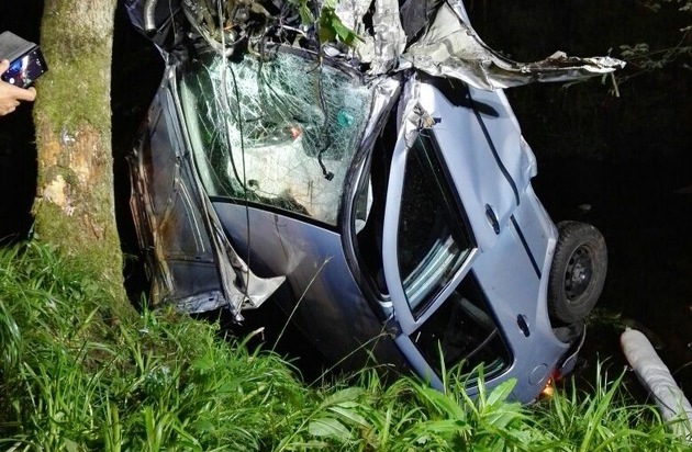 OSTERODE (Kam) In der Nacht von Freitag auf Samstag ereignete sich gegen 02:45 Uhr ein Verkehrsunfall auf der L 521 von Sieber in Richtung Herzberg, bei dem zwei Personen verletzt wurden und stationär behandelt werden mussten. Der PKW kam dabei zunächst nach rechts von der Fahrbahn ab. In der Folge fuhr der PKW-Fahrer nach links die Böschung zur Sieber hinunter und kam frontal an einem Baum, hochkant, zum Stehen. Der Fahrzeugführer und seine Beifahrerin konnten sich noch selbstständig aus dem Fahrzeug befreien und machten auf der Straße auf sich aufmerksam. Nach derzeitigen Ermittlungsstand verursachte der 43 jährige Mann aus dem Altkreis Osterode den Unfall in Folge nicht angepasster Geschwindigtkeit und unter dem Einfluss von Alkohol. An der Unfallstelle waren neben der Polizei auch der Rettungsdienst und die Feuerwehr im Einsatz, welche die Unfallstelle ausleuchtete.