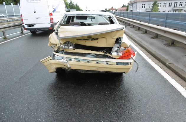B243 - (NEI)Am Freitagmittag ereignete sich ein schwerer Verkehrsunfall auf der B243. Ein 18 jähriger Fahranfänger geriet augfgrund nicht angepasster Geschwindigkeit auf regennasser Fahrbahn beim Durchfahren einer Kurve ins Schleudern und fuhr hierdruch gegen die Mittelleitplanke. Hiernach drehte sich der PKW auf der Fahrbahn und wurde von einem nachfolgenden LKW erfasst. Der Unfallverursacher wurde durch den Unfall leicht verletzt. LKW als auch PKW wurden stark beschädigt.