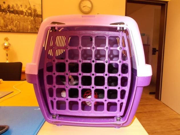 Es handelt sich um eine junge, schwarze Katze mit weißem Hals und Nasenbereich und weißen Pfoten. Sie saß in einer rosa/violettfarbenen Transportbox.