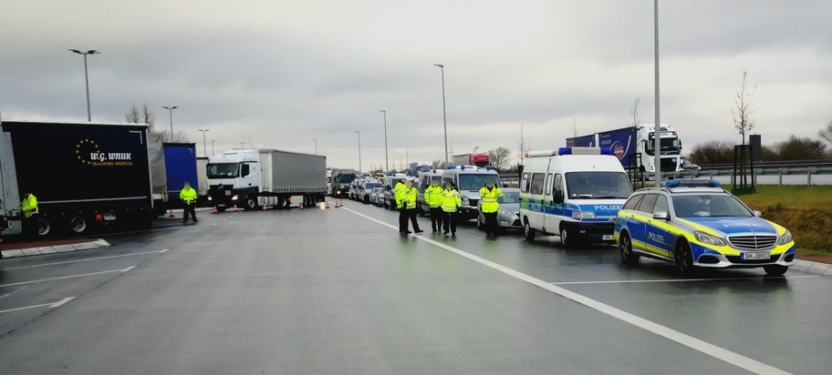 Donnerstagmorgen (01.02.2018) wurde der Schwerlastverkehr auf der A7 durch spezialisierte Kräfte der Verkehrsüberwachung kontrolliert. Zwischen 09:00 und 12:00 Uhr wurden alle Lkw auf den Parkplatz "Jalmer Moor" geleitet und von Beamten des Polizeiautobahn- und Bezirksreviers Nord, Kollegen des Sondereinsatzzuges der PD AFB, des Zolls, der Bundespolizei und des Bundesamtes für Güterverkehr überprüft.