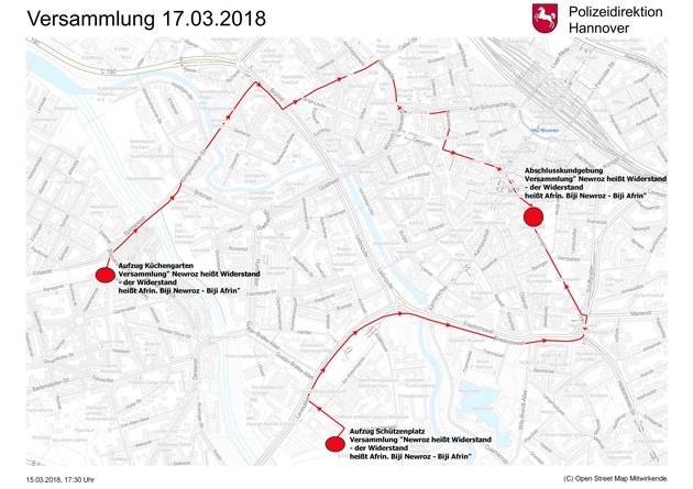 In Ergänzung zu der heutigen Pressekonferenz der Polizeidirektion Hannover informieren wir Sie über die vereinbarten Aufzugsrouten, die heute Nachmittag mit den Anzeigenden einer Versammlung im Rahmen eines Kooperationsgespräches vereinbart wurden.