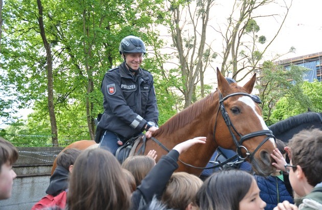 Zum Abschluss gab es für die Schülerinnen und Schüler noch drei spezielle Vorführungen: Einsatztrainer zeigten ihnen, wie eine Festnahme abläuft und die Reiter- und Diensthundführerstaffel beeindruckte die jungen Gäste mit ihren Darbietungen.
