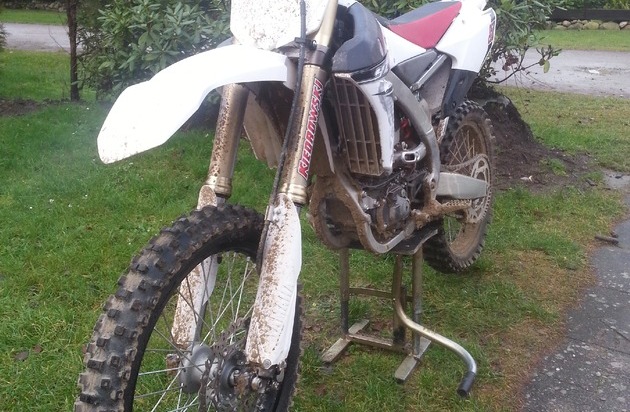 ++Cross-Maschine gestohlen++ Bramstedt. In der Zeit Samstag 08:00 Uhr bis Sonntag 12:00 Uhr wurde in der Bogenstraße Bramstedt eine neuwertige, vornehmlich weiß verkleidete Motocrossmaschine der Marke Yamaha, Typ YZ 250 F14, aus einem Schuppen entwendet. Das Krad war nicht zugelassen und somit auch nicht mit einem Kennzeichen versehen. Sachdienliche Hinweise erbittet die Polizei Schiffdorf unter Tel. 047069480. (Bilder siehe Anhang)