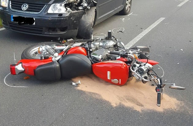 Am Samstag kam es gegen 16:15 Uhr auf der L129 zwischen den Ortschaften Wremen und Imsum zu einem Verkehrsunfall zwischen einem Motorrad und einem PKW. Eine 48-jährige Motorradfahrerin aus Bremerhaven befuhr hierbei die L129 in Richtung Wremen. In einer Rechtskurve wurde Sie vermutlich aufgrund nicht angepasster Geschwindigkeit nach außen getragen und geriet in den Gegenverkehr. Ein 68-jähriger Mann aus Voerde am Niederrhein konnte mit seinem PKW noch ausweichen, eine hinter ihm fahrende 42-jährige Frau aus Hoya im Kreis Nienburg nicht. Das Motorrad kollidierte frontal mit ihrem PKW. Durch den Unfall wurde die Motorradfahrerin lebensgefährlich verletzt. Sie wurde mit dem Rettungshubschrauber in eine Klinik nach Bremen geflogen. Die PKW-Fahrerin erlitt einen Schock und wurde ebenfalls behandelt. Für die Dauer der Unfallaufnahme und Bergung wurde die L129 für ca. 2 Stunden voll gesperrt. Der Gesamtschaden beträgt ca. 10.000 Euro.