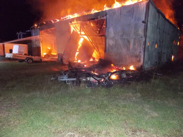 In der Nacht von Mittwoch, 07.09.16, zu Donnerstag, 08.09.16, geriet gegen 2.00 Uhr in Cuxhaven, Alte Marsch, ein Wohnwagen in Brand. Das Feuer griff auf eine Lagerhalle mit diversem Schaustellerbedarf über. Die Lagerhalle und der Wohnwagen wurden komplett zerstört. Der Schaden beläuft sich nach bisherigen Schätzungen auf etwa 200.000 Euro. Die Polizei berichtete. Die Brandermittler der Polizei Cuxhaven gehen nach derzeitigem Ermittlungsstand davon aus, dass das Feuer vorsätzlich gelegt wurde. Die Polizei bittet Zeugen, die Personen, Fahrzeuge oder sonstige Auffäligkeiten im Bereich Alte Marsch bemerkt haben, sich unter 04721-5730 zu melden. Dieser Meldung liegt Bildmaterial bei.