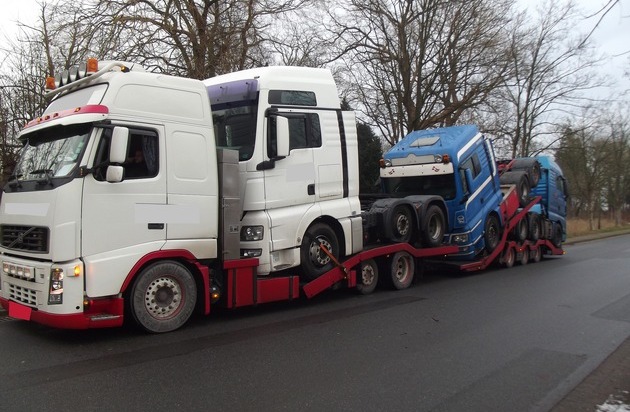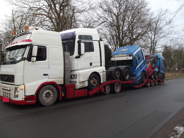 Hagen. Erst gestern berichteten wir von einem verkehrsunsicheren Sattelzug auf der A27 als besonderem Ereignis. Heute Vormittag (07.12.2016) mussten die Polizisten des Polizeikommissariats Geestland jedoch erneut einen LKW mit Anhänger aus dem Verkehr ziehen. Südlich von Bremerhaven kontrollierten die Beamten einen niederländischen LKW. Es handelte sich um einen Fahrzeugtransporter, beladen mit drei Sattelzugmaschinen, auf dem Weg von Dänemark in die Niederlande. Bremsen und Zugeinrichtungen waren sowohl beim Zugfahrzeug als auch beim Anhänger defekt. Zudem war die Lenkung des LKW ausgeschlagen und die Reifen am Anhänger abgefahren. Neben den gravierenden technischen Mängeln war der Zug um mehr als vier Tonnen überladen und auch die Abmessungen entsprachen nicht den Bestimmungen. Der LKW mit Anhänger waren zu lang und auch zu hoch. Der Lkw mit dem Anhänger wurde einem Prüfingenieur vorgeführt, der beide Fahrzeuge als "verkehrsunsicher" bewertete. Bei beiden Fahrzeugen wurden die Kennzeichen demontiert und durch die Polizei sichergestellt. Der Betrieb dieser Fahrzeugkombination wurde durch den zuständigen Landkreis Cuxhaven untersagt. Das Gespann muss nun entladen werden und darf erst wieder im öffentlichen Straßenverkehr gefahren werden, wenn durch einen Prüfingenieur die Mängelfreiheit bestätigt wird. Fahrzeugführer und Fahrzeughalter müssen mit Bußgeldbescheiden über insgesamt mehrere tausend Euro rechnen.