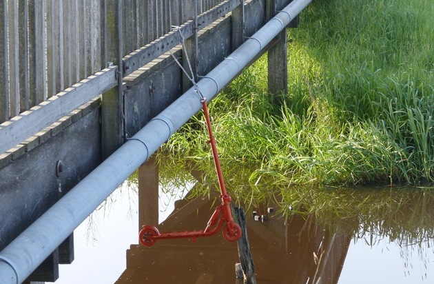 In der Nacht zu Samstag befestigen bisher unbekannte Täter ein etwa 10m langes Nylon-Seil (grün/blau/gelb) über eine Holzbrücke des Gemeindeverbindungsweges zwischen Spaden und der Schiffdorfer Stauschleuse. Eine 41jährige Radfahrerin aus Spaden bemerkte das Hindernis zu spät, stürzte beim Abbremsen mit ihrem Fahrrad und zog sich leichte Beinverletzung zu. Bei der polizeiliche Sachverhaltsaufnahme konnte weiterhin ein am Brückengeländer befestigter Kinder/Tretroller, Farbe orange, sichergestellt werden.